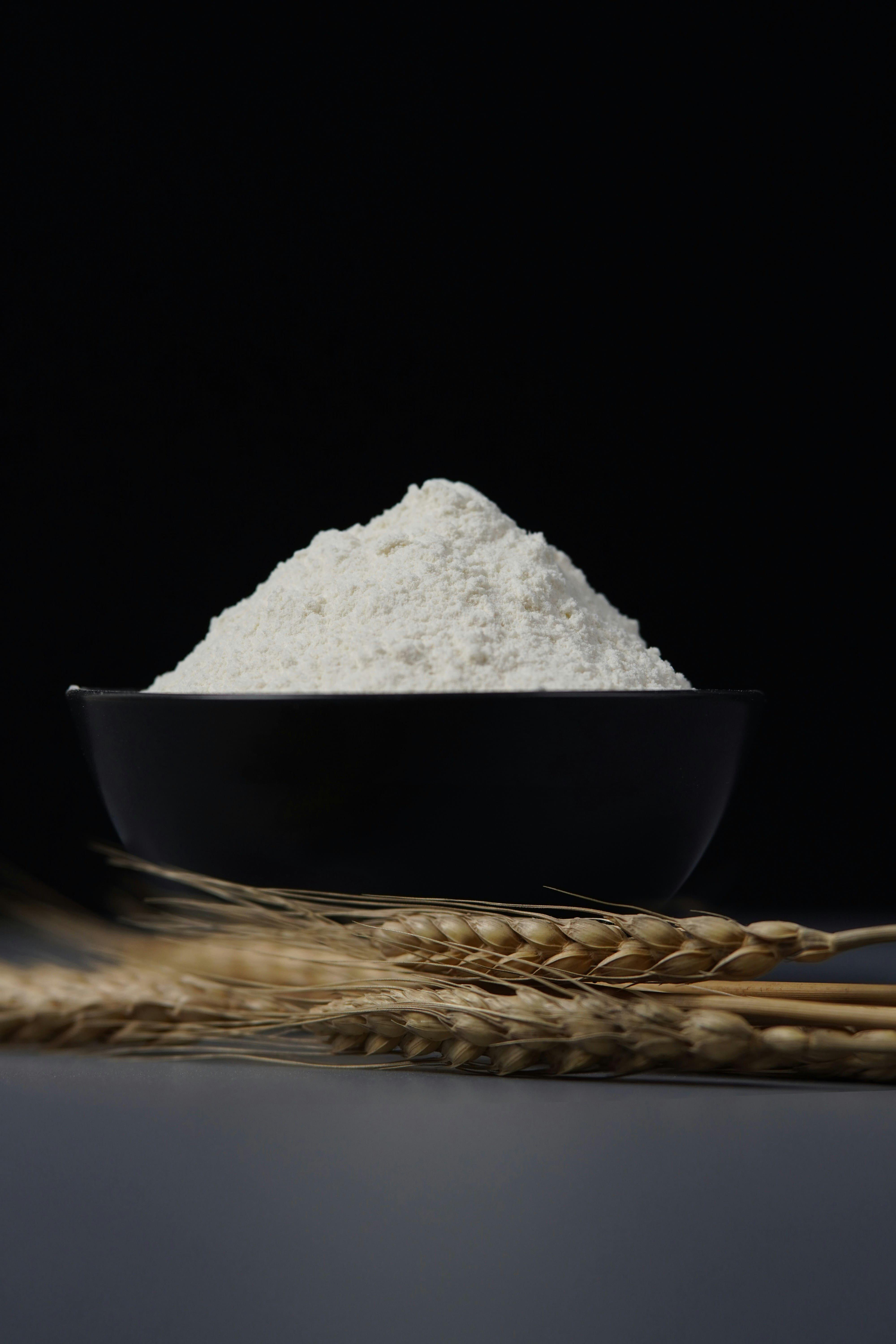 Fine wheat flour in a black bowl with wheat stalks, representing the natural ingredients behind SING-LIN FOODS ramen noodles.