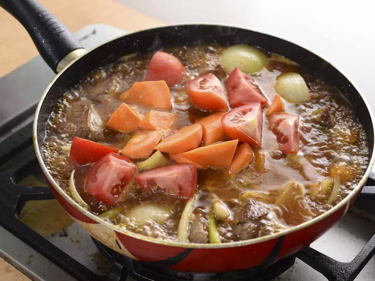 移至電鍋,放入牛腩、蕃茄、紅蘿蔔、八角燉煮,起鍋以鹽調味並組合麵條